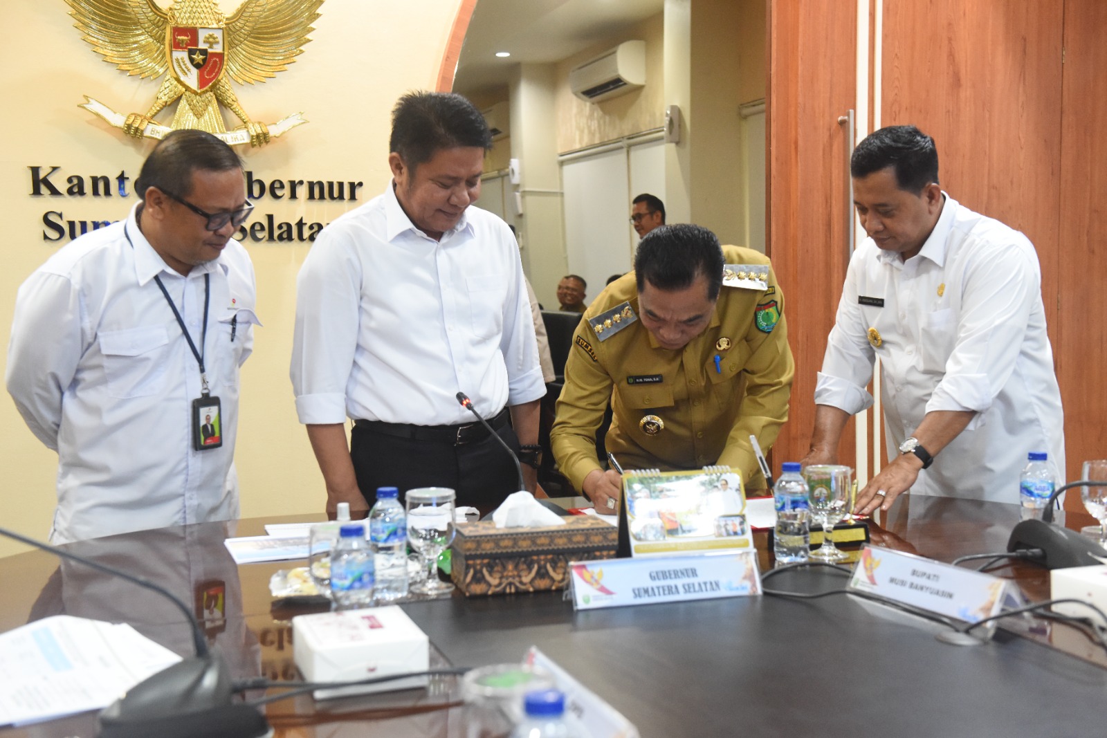VIVA SUMSEL.COM, PALEMBANG – Gubernur Sumatera Selatan (Sumsel) H Herman Deru bersama Bupati Kabupaten Musi Banyuasin H. M. Toha dan Bupati Banyuasin H. Askolani menandatangani berita acara kesepakatan bersama terkait